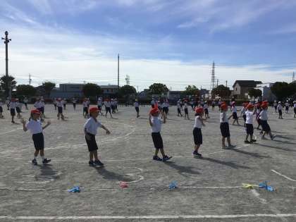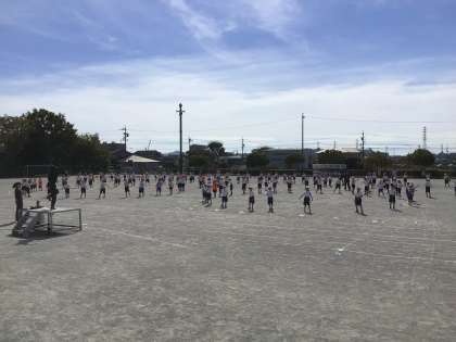 運動場で、低学年が競遊の練習をしていました。毎年、低学年の競遊は可愛い踊りもあって、学校中が楽しみにしている種目です。