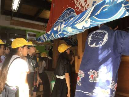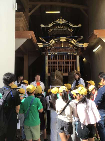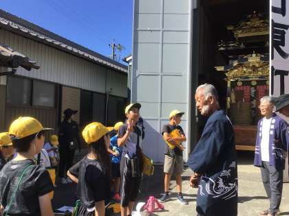 地域の山車蔵見学では、町の方がそれぞれの山車の特徴を説明してくださいました。貴重な山車を間近に見て、子どもたちはその大きさに驚いていました。また、彫刻に興味をもち、三町の山車の彫刻を見比べている子もいました。挙母祭りへの興味が高まったようです。