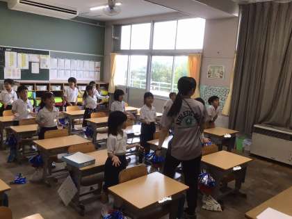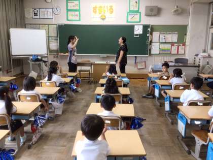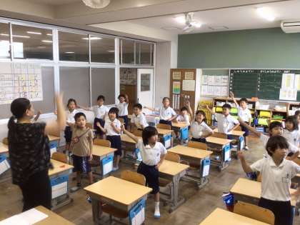 1年生は学級活動の時間に、国際理解の学習をしました。最初にALTの先生が英語で挨拶をすると、きょとんとした表情の子どもたちがたくさんいました。中には「え〜、わからーん」と素直な反応をする子も。それでも、英語の歌を歌ったり、先生たちのお手本を見たりするうちにだんだんと慣れてきて、英語でのやり取りを楽しんでいました。