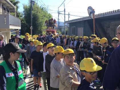 全校が待ち受ける学校に山車が到着すると、6年生からは安堵の表情が見られました。事故なく無事に到着できて、ほっとしました。