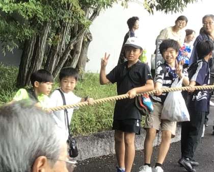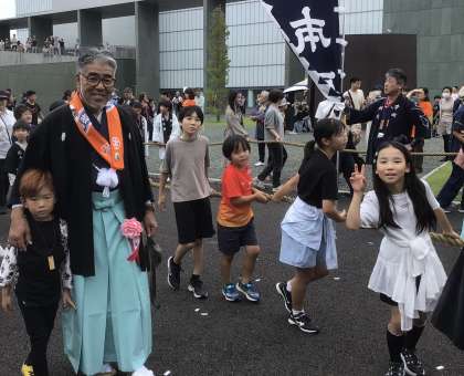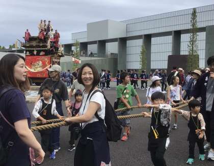 南町・本町・東町の山車は、美術館の前まで上がってきました。今年初めての試みだそうです。みんなとってもいい笑顔です。