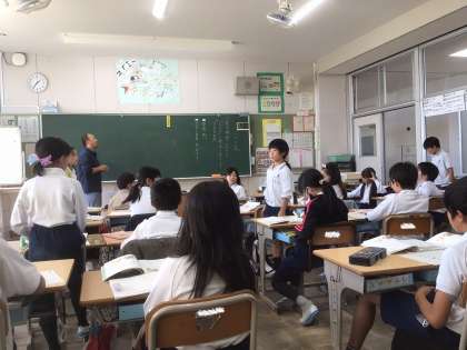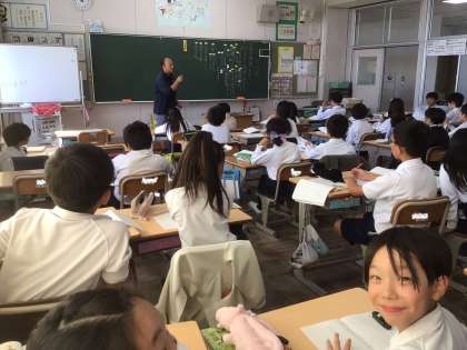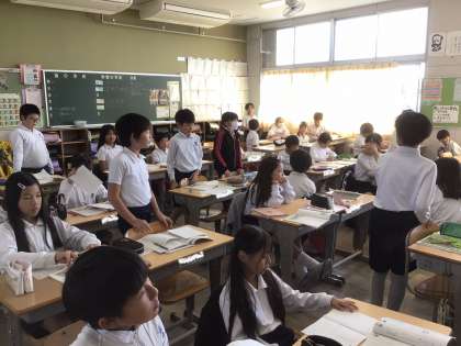 そんな雰囲気の中、4年生の国語科「一つの花」の学習では、第4・5場面について、熱心に話し合いがされていました。特に、「花に込められた父の思い」についての話し合いになると、子どもたちの思いが溢れ出し、教室のあちこちで自然に議論が始まっていました。担任の先生が親としての気持ちを語ると、子ども達からは「なんか泣けてくるわ〜」との声が聞かれました。物語にどっぷりと浸り、自分の思いを素直に発信できる教室の雰囲気がとても素敵でした。