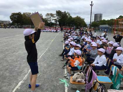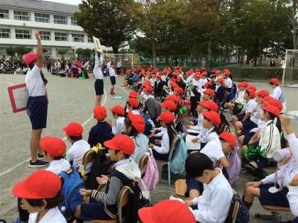徒競走が予定より早く進み、途中で休憩時間をとりました。児童席では、6年生を中心に仲間の頑張りに声援を送っています。