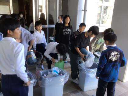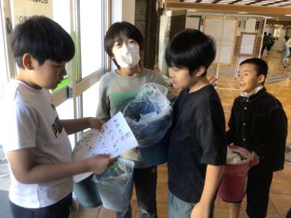美化委員会が企画してくれた分別フェスティバルが絶賛開催中です。お昼の放送でも宣伝しているので、分別を意識している学級が増えてきました。各学級の分別すごろくに貼られるシールの数も増えてきました。ゴミ捨てに立ち会っている美化委員会の子どもたちもその効果を実感しているようです。ぜひ、この機会に、学校全体の意識を向上させていきましょう。