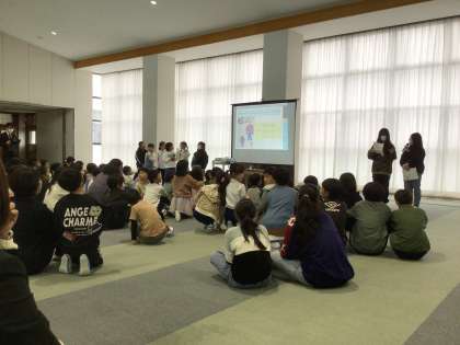 今日は2年生が「わらべちゃん」で、世界の国の挨拶をクイズにして発表してくれました。大阪万博に足繁く通った子が、世界の挨拶をノートにまとめたものから出題されました。クイズは2択で、ふれあいホールを2つに分け、自分が答えだと思う方へみんなで移動する形式で、参加した子たちは笑顔いっぱいでした。お隣の国韓国、国の言葉が2つあるカナダなどいろいろな国の挨拶を知ることができました。教室へ戻るときに「オラー」と早速知った挨拶を使っている子もいました。挨拶は自然と笑顔を生みます。童子山を挨拶いっぱいにしていってくださいね。