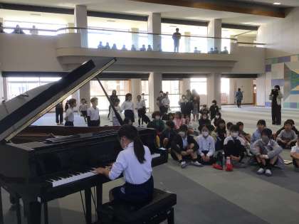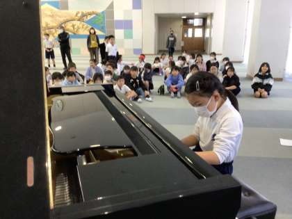 今日のわらべちゃんは、いろいろなピアノの大会で入賞している3年生の子がピアノ演奏を披露しました。演奏したのは、ショパン作曲「ポーランド歌曲集Op.74-1」です。温かな音色、かろやかな旋律、お天気の良かった今日の午後の日差しのような、優しく素敵な演奏でした。一つ一つの音が聴く人の心を惹きつけ、会場からは大きな拍手が送られていました。