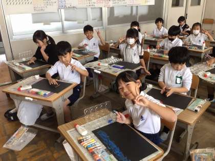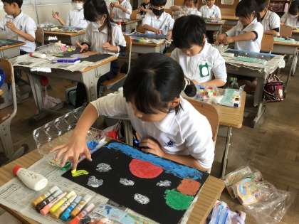 2年生の図画工作科「とろとろ絵の具でかく」の学習では、乾くと紙粘土になる液体に絵の具を混ぜて、とろとろ絵の具を作りました。初めて経験することなので、子どもたちも興味津々。先生のお話も真剣に聞けました。