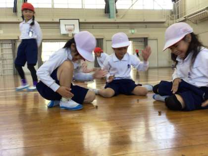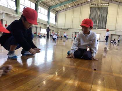 今日は、その自慢のどんぐりごまを持ち寄り、学年みんなで遊びました。それぞれのクラスのチャンピオンを決めた後に、学年チャンピオン決定戦を行いました。一番長く回った子の回し方がとても上手で、見ていた子達からは驚きの声や称賛の声が上がっていました。