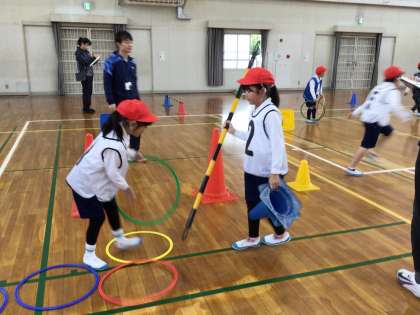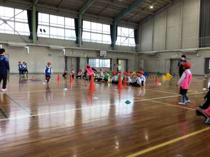 2年生で体育科の研究授業がありました。課題は「楽しくリレーをするにはどうすればよいかな」です。授業の最初に、先生から「楽しいリレーとはどういうリレーなのかな」尋ねられると「障害物が多すぎても少なすぎても楽しくないよ」「くねくねしたコースはやりにくかったよ」などの意見が出て、どんなコースを作るとみんなが楽しめるのかを考えていました。その後、チームごとにコースを作りました。「コーンは5個にしよう」「くねくねの間は広めにしたら?」などアイデアを出し合いながら完成させました。実際に対戦してみると、どのコースも楽しくて子どもたちは大変盛り上がっていました。競走の中で楽しい部分や改善が必要な部分を考えました。これからもどの子も競走が楽しめるようにコースを改良していきます。