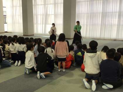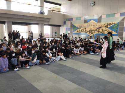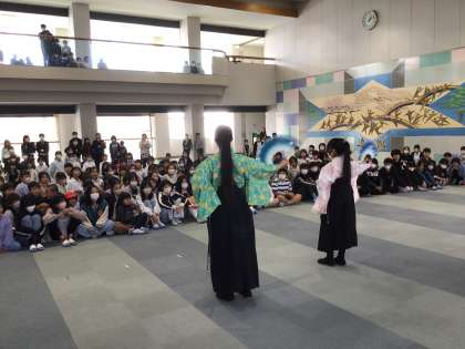 今日の「わらべちゃん」は、4年生と6年生が殺陣を披露してくれました。2人は、2年ほど前から習っているようで、刀の構え方も堂にいっていました。殺陣を見ることが初めての子どもも多く、ポーズが決まるたびに「すご〜い」などの声があちこちから聞かれました。もしかしたら、「おかわりちゃん」でまた見られるかもしれませんね。