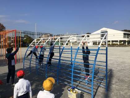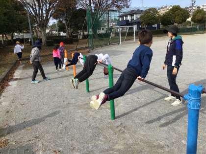 山あす1階チームは、体育科の学習で鉄棒に取り組んでいます。ぶら下がり・ふとん・前回り・逆上がりなど自分に合った色々な技に挑戦しています。ぶら下がりは1分程度維持できる子もおり、やる気と頑張りが伝わりました。また、体育に必要な道具を進んで運んでくれる子増えてくるなど、どんどんできることが増えてきています。