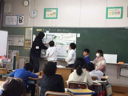 3年生の理科「動物のすみか」の学習では、学校の敷地内で見つけた動物を発表していました。ずいぶん寒くなってきたので、生き物はあまりいませんでしたが、子どもたちは目を凝らして一生懸命見つけてきたようです。学校の地図に、ダンゴムシやカラスなど見つけた動物を書いたカードを貼っていくと、見ている子から「よく見つけたな〜」と感嘆の声が聞かれました。