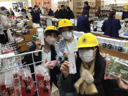 お昼ご飯を食べた後は、買い物タイム!「八ツ橋を買っていくよ」「お漬物を頼まれたんだ。でも高いなあ」などと言いながら一生懸命選んでいました。