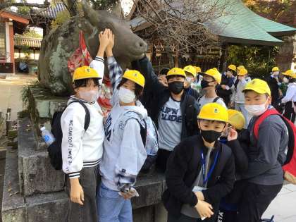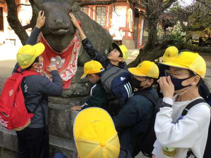 牛を撫でると良いと聞き、みんなで撫でました。赤い目を触るとものすごく賢くなると聞き、友達に抱き上げてもらって触っている子もいました。