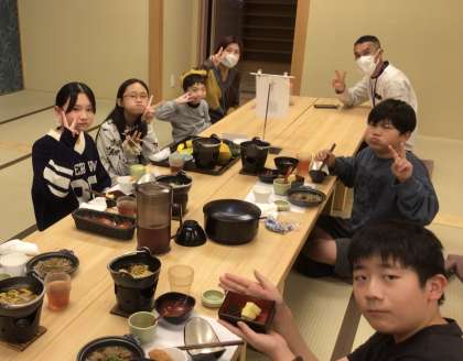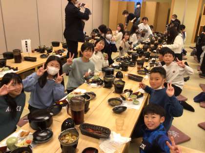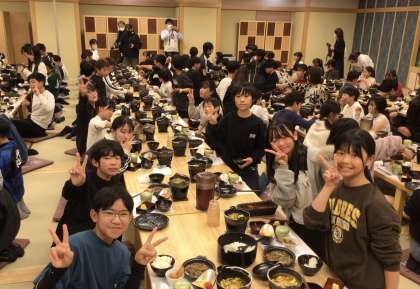 旅館への到着時刻は学級ごとに違いましたが、遅く到着した学級の子どもたちがさっと準備をして食事会場に集まることができたので、予定通り入館式を始められました。旅館の人に「お願いします!」と元気よく挨拶をした後は、お待ちかねの夕食タイムとなりました。お腹がぺこぺこな子どもたちは、おかわりをたくさんしていました。