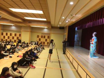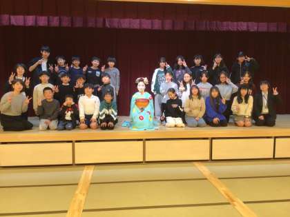 舞妓さんが舞台に登場すると、子どもたちの目は釘づけになりました。写真で見たことはありますが、本物を見るのは初めてです。思っていた以上に綺麗で、優雅に踊る舞妓さんに心を奪われました。
