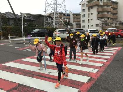 通学団では、団長・班長・副班長として元気よく挨拶をしたり、班のみんなをまとめたりして、頼もしく引っ張っています。