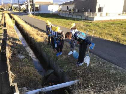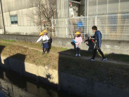 今日は、12月の長田川はどのようになっているのかを調べるために、校外学習に出かけました。今日の長田川と以前の長田川の様子を比べながら、「今までは土や草がたくさんあって、生き物を捕まえられたのに、今は草も土もなくなってきれいになってしまったね」「生き物がいなくなってしまったのは、寒くなったからなのかな。他にも理由があるのかな」など、さまざまなことに気付きました。調査したことをどのようにまとめていくか、これから考えていきます。