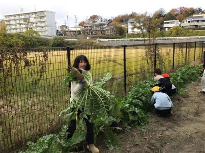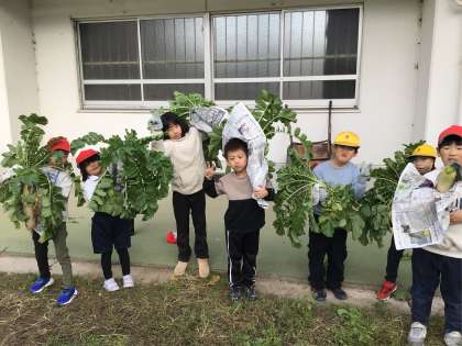 山あす1階チームで大根掘りをしました。腕よりも太くなった大根を見て子どもたちはもびっくり。「大根の葉を持って回しながら抜くと周りの土がほぐれてきれいに抜けるよ」と農業指導員さんに教えてもらい、みんな大根を折らずに抜くことができました。収穫した大根は、お家で食べることを楽しみにして笑顔で持ち帰りました。