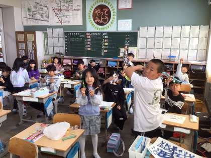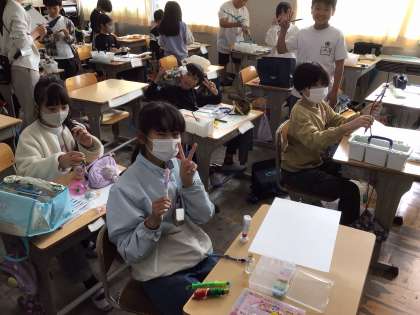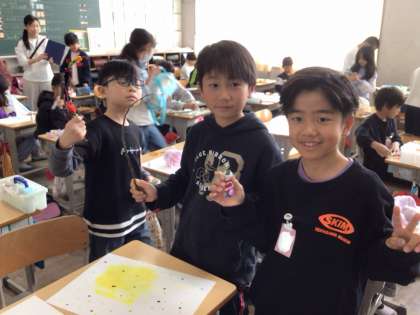 3年生の図画工作科の学習で、オリジナルペンを作りました。木の枝とモールを使って、個性あふれるペンがたくさんできました。書くときは木の枝の先に絵の具をつけます。子どもたちは、オリジナルペンを使って、楽しそうに絵を描いていました。