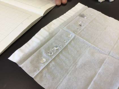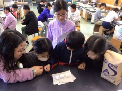 5年生は1週間前の理科の授業で、ミョウバンと塩の水溶液を作り、そのまま放置したり、冷蔵庫で冷やしたりしました。今日、その水溶液を見てみると、キラッキラの大きな結晶ができていて子どもたちはとても驚いていました。「ミョウバンの水溶液を冷やすと溶かしたものが出てきたよ」という意見に対して、「塩水は冷やしても、塩は出てこなかったよ」という意見が出て、みんなで溶かす物の性質について考えていました。