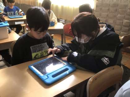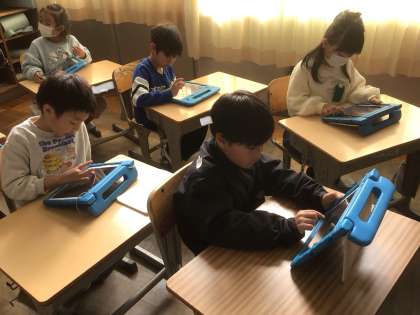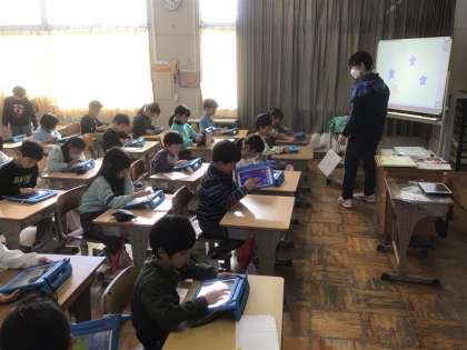 ICT支援員さんをお招きして、「プログラムを考えて、プログラミングを体験しよう」という学習を行いました。「プログラミング」という言葉を聞いて、子どもたちは「コンピュータのことかな」「自分でゲームを作ることかな」などと想像を膨らませていました。「プログラミング」とは「プログラム(命令)を組み合わせて与えること」であると知り、良い姿勢になるためのプログラミングや、朝起きてから学校に行くまでのプログラミングについて考え、コンピュータを使わなくても身近な生活に関わっていることを理解しました。今日は、ビスケットというアプリを使って、描いた絵を動かす体験をしました。試行錯誤しながら、工夫を凝らして楽しく活動していました。