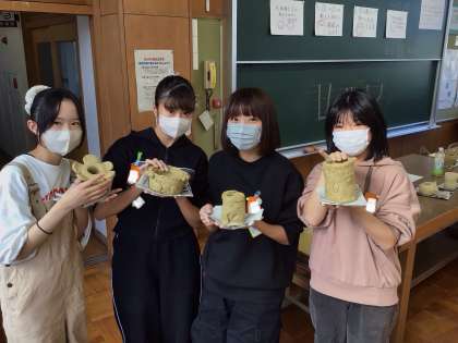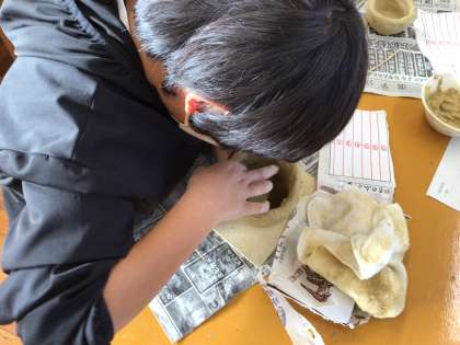 6年生は卒業制作として土器を作っています。土器は、ヒモ状の粘土を積み上げていく「ひも作り」という手法で作っています。大体の形ができたら、それぞれの思いが形になるように内部まで形を整えたり、外側をつるつるにしたりしていきます。この土器のテーマは、「童子山小学校の思い出」なので、童の森で遊んだことを表現するために、童の森で拾ってきた枝やどんぐりで模様をつけたり、楽しかった修学旅行を表現するために土器に角をつけたりしていました。世界でたった一つしかない土器の完成が楽しみです。