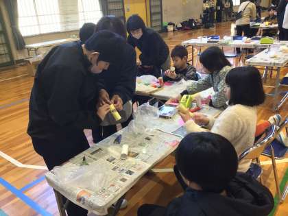 山あす学級は、朝日丘中学校へ小中交流会に行きました。中学生のおもてなしを受けて、クイズや工作、魚釣りをしました。おもてなしを楽しみながら、久しぶりに会ったお兄さんやお姉さん、転校した他校の友達に会って笑顔で過ごしました。
