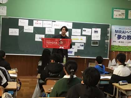 夢の教室2日目です。今日は、トヨタ自動車野球部の池村健太郎投手(通称 ケム)が講師でした。小さいときからできることが多かった池村選手ですが、プロへの道は厳しく、多くの挫折を味わったそうです。そこから脱却するために、思い出しても涙が出るくらいの努力をされたようで、努力と謙虚さの大切さを子どもたちに伝えてくださいました。授業の最後には、夢を叶えるために必要なキーワード「感謝・縁」「色々な経験」「平常心」を教えてもらい、子ども達にとって生き方を考えるヒントになりました。ちなみに池村投手は、小学生の頃、毎日2時間は勉強していたそうですよ!