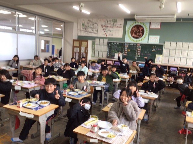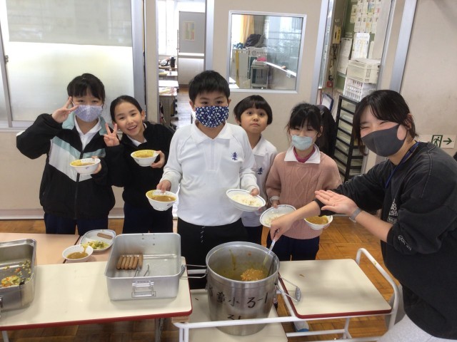 今日の給食は、先日、給食委員会が発表した「好きな給食ランキング」でも第一位になったカレーライスです。3年生の子どもたちも大喜び。おかわりにはたくさんの子が行列を作っていました。美味しく食べてくださいね。