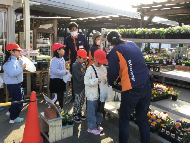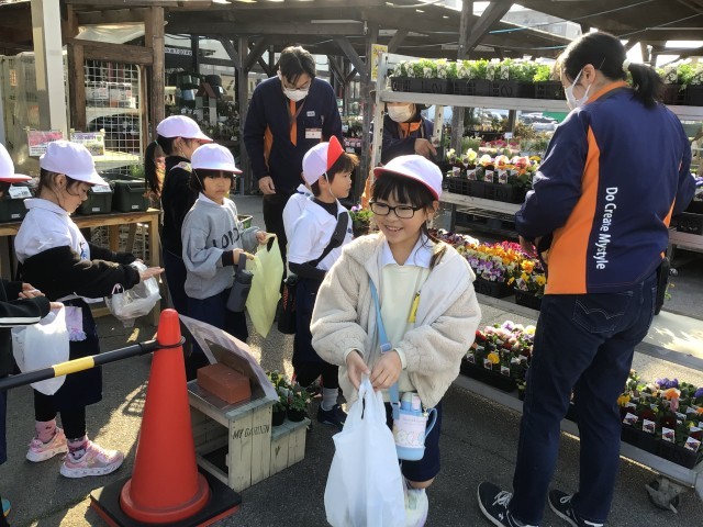 一人一人が店員さんから手渡しで苗を受け取り、「ありがとうございます」と感謝の気持ちを伝えました。自分のパンジーを受け取った子どもたちは、にこにこしながら「やったーパンジーだ!」「きれいだね」と嬉しそうでした。これから、一生懸命お世話をして、綺麗な花を咲かせてくださいね。