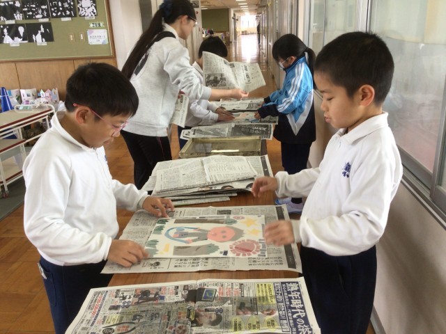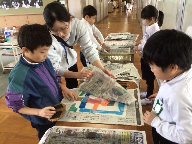 2年生の図画工作科「たのしく うつして」では、色版画に挑戦しています。縄跳び、書き初め、鍵盤ハーモニカなど、一生懸命打ち込んでいる自分の姿、頑張っている自分の姿を版画で表現します。色版画は、刷りとり紙を水に濡らして版の上に乗せ、新聞紙を被せて丁寧に刷ります。子どもたちは新聞紙をめくると「色が綺麗に写ったよ」「もう少しバレンで濃くこすってみようかな」などと言いながら作品を眺めていました。鑑賞会が楽しみです。