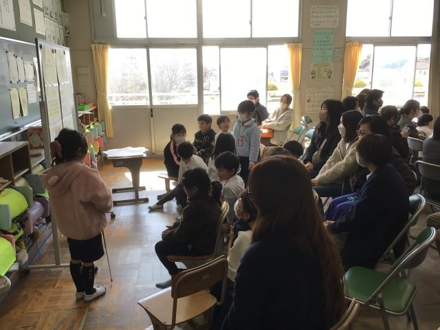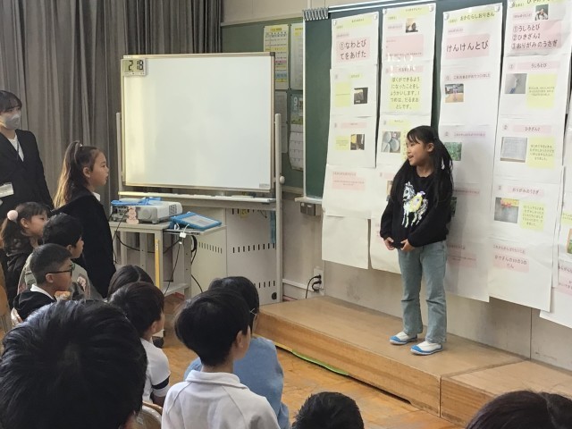 1年生の学習発表会では、1年生になってから頑張ってきたことや打ち込んできたこと、成長したことなどを一人一人発表をしました。国語や算数などの学習で自分の成長を感じたことや、なわとびの回数や種目数を増やすことに打ち込んだことなどを写真や動画などを交えながら発表しました。発表会の後には、日頃お世話になっている保護者の方への感謝を伝えるために「ありがとうの花」を歌いました。感動してくださるお家の方も多く、子どもたちの成長を感じていただける会になりました。