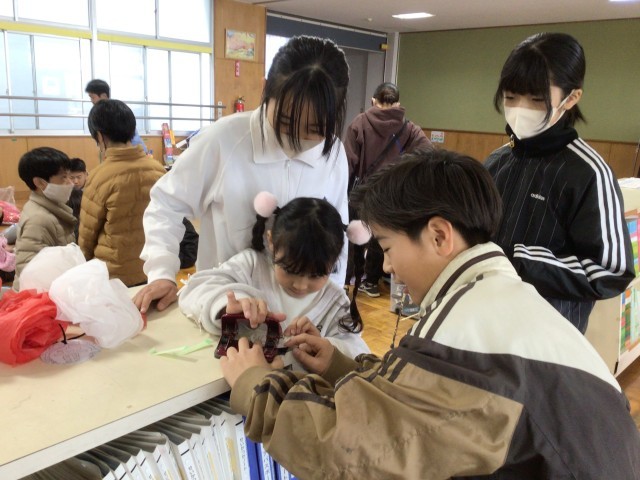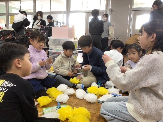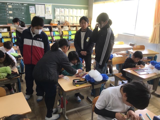 来週の「6年生を送る会」に向けて5年生と1年生が一緒に秘密のプレゼント作りをしました。5年生は1年生に作り方などを優しく教えていました。5年生が丁寧に、根気強く教えてくれたおかげで、素敵なプレゼントを作ることができました。6年生の喜ぶ顔が早く見たいです。