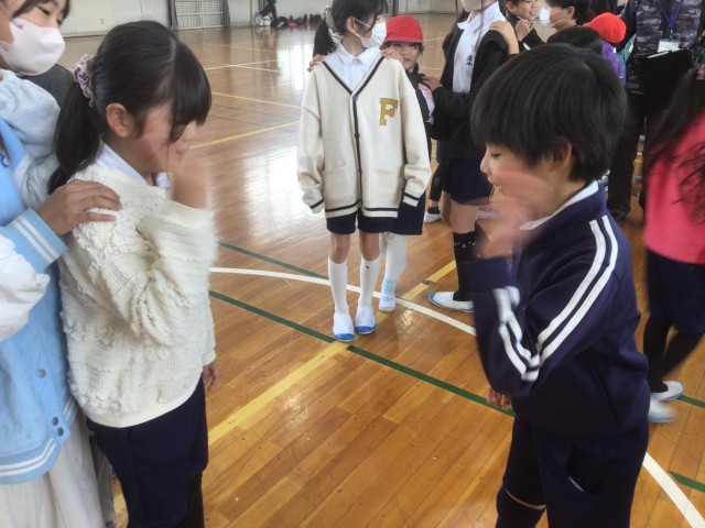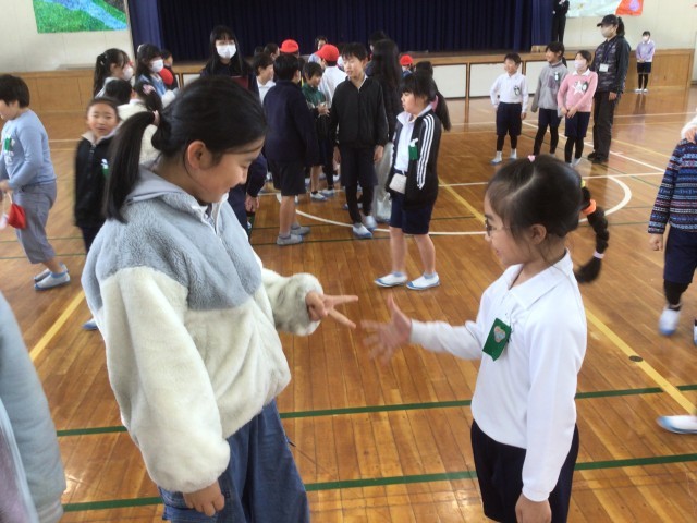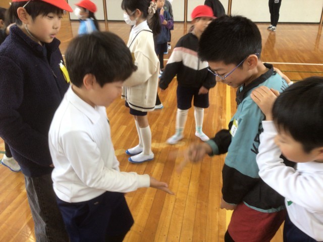 今日の長放課に、2年生と5年生が体育館に集まって、一緒にジャンケン列車で遊びました。これは、赤十字委員会が全校児童が仲良くなれるようにと企画したものです。委員会活動などで参加できない5年生もいましたが、2年生と5年生でジャンケンをするように呼びかけもあり、積極的に異学年の交流ができていました。参加した子はみんな笑顔で、「楽しかったよ! またやりたいな」などと話していました。