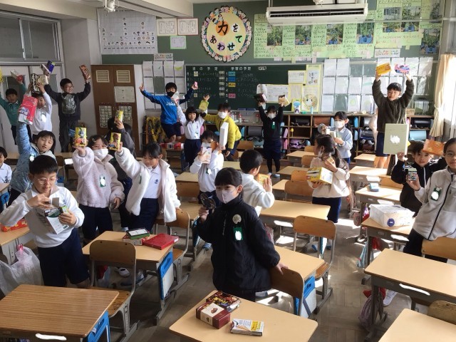 2年生の算数科「はこの形」の学習では、お家から持ち寄った空き箱を使って箱の形の特徴を調べたり、工作用紙を切り貼りして箱を作ったりしました。また、ストローを粘土玉で連結して箱の形を作りました。「辺の数は12だから、ストローは12本いるね」「頂点の数は8つなので、粘土玉を8個作ろう」などと、これまでの学習を生かして活動していました。お家の方が、箱をたくさん用意してくださったので、しっかりと勉強することができました。ありがとうございました。