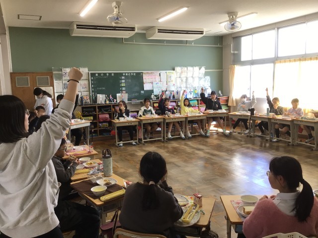 今日は、6年生と校長先生が一緒に給食を食べました。さすが6年生!おかわりじゃんけんにたくさんの子が参加していました。お題に沿っておしゃべりをしながら食べていましたが、好きなアーティストとして「ピコ太郎」の名前が挙げられ、子どもたちの意外な趣味がわかりました。また担任の先生のいいところとして、「優しいところ」「面白いところ」「可愛らしいところ」などの素敵な言葉がたくさん並べられていました。みんな明るくて、楽しい雰囲気で給食の時間を過ごしました。実行委員の皆さん、ありがとう。残りの日数も学校生活を楽しんでくださいね。