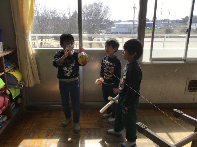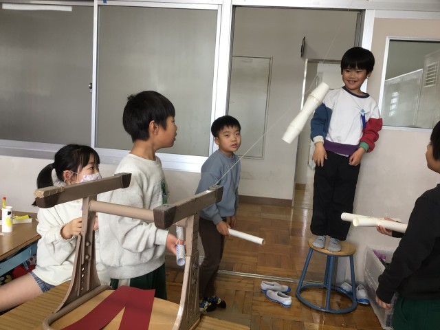 1年生の図画工作科「スルスルビューン」の学習では、教室内にたこ糸を結んで滑らせる場所を作り、紙コップやトイレットペーパーの芯などで作った物を滑らせて楽しみました。遊びながら、クリップの数や付け方を変えると滑り方が変わることに気付き、それぞれ工夫していました。作品発表会では、飛行機や新幹線、猫、お気に入りのキャラクターなどが登場し、みんなで楽しく学習することができました。