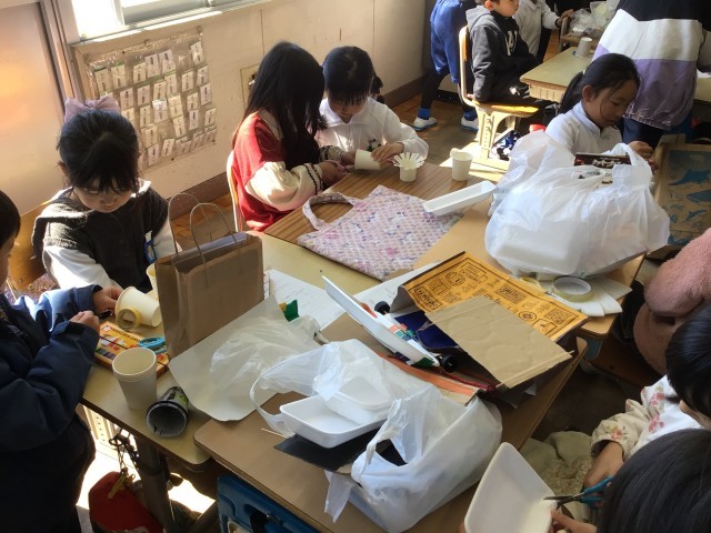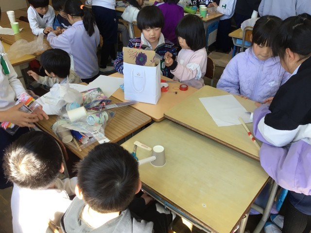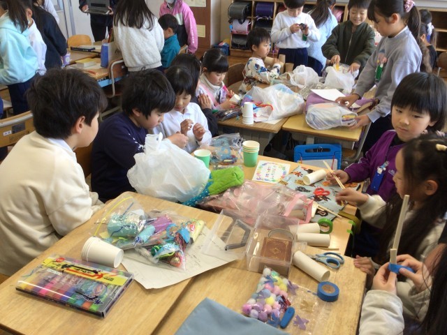 2年生の最後の学級が、1年生を招待して、おもちゃ祭りを開催しました。2年生は、1年生と楽しい時間を過ごすために「どんなおもちゃがいいかな」「作ったおもちゃでどのように遊ぼうかな」と考えて準備をしてきました。本番では、一生懸命に作り方を説明をしたり、楽しく遊べるようにアドバイスをしたり、お兄さんお姉さんとして頑張る姿がたくさん見られました。参加した1年生からは「楽しかった」「一緒に作れて嬉しかった」と言ってもらいました。2年生は「上手くできたところがたくさんあったけど、もうちょっと準備した方がよかったこともあった」と振り返っていました。4月からは、もう一つ学年が上がります。お兄さん、お姉さんとしての活躍をますます期待しています!