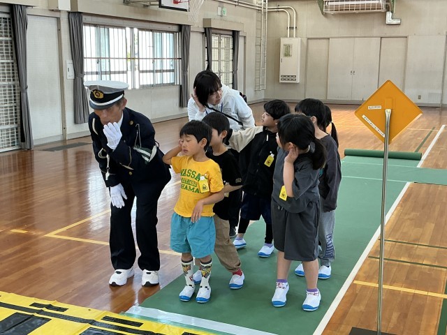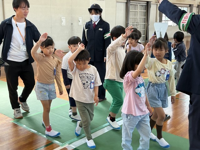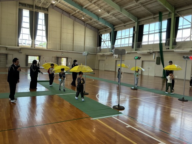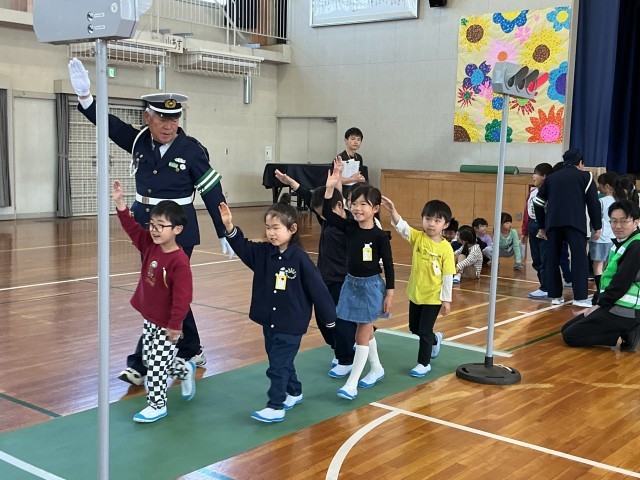 1年生を対象に、体育館で交通安全教室を実施しました。 交通指導員の方にお越しいただき、信号の見方や横断歩道・踏切の安全な渡り方について、グループごとに丁寧に教えていただきました。子どもたちは実際に体を動かしながら、どのように周囲を確認すればよいかを学ぶことができました。