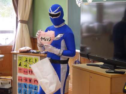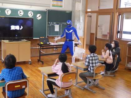 3・4年生。手品でつかみをした後、「萩野ブルー」が登場。子どもたちきょとんとしていました。初日に強烈な印象でした。