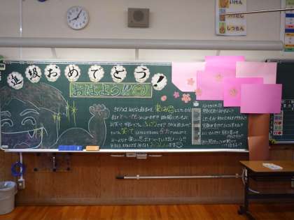 上:担任のメッセージです。迫力があります。教室に入るのが楽しくなりますね。
