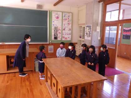 1・2年生生活科。2年生の子が1年生に各教室の名称や用途を話しています。
