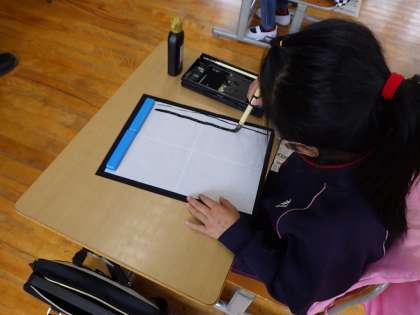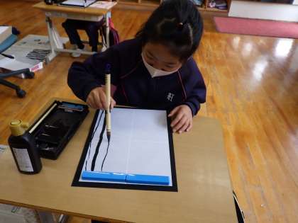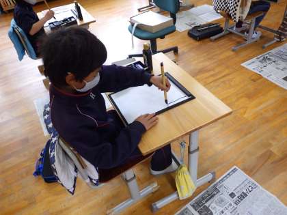 3・4年生書写。3年生は初めての筆遣いです。まずは、筆のおき方を学びます。