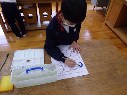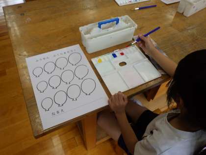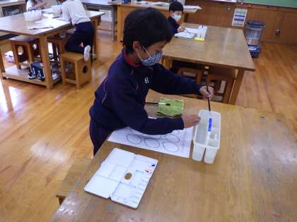 3・4年生図工。水彩絵の具の使い方を学んでいます。
