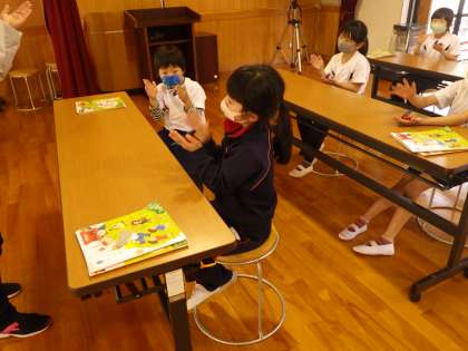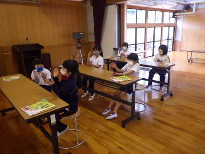 1・2年生音楽。まだ歌は歌えません。打楽器の演奏が中心です。