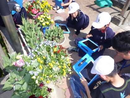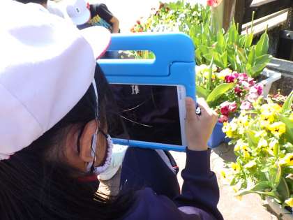3・4年生理科。花の高さをアイパッド付属のアプリで計測しています。