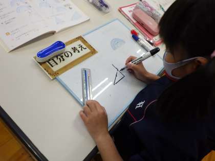 4年生算数。ホワイトボードに課題の解答をかきます。何度も書き直すことができ便利です。