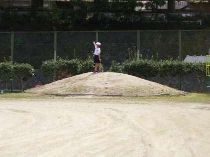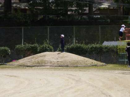 1年生生活科。明日、三角山山頂で今年度の目標を叫びます。今日はその練習です。一応、ミニ三角山と名前がついています。