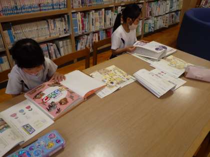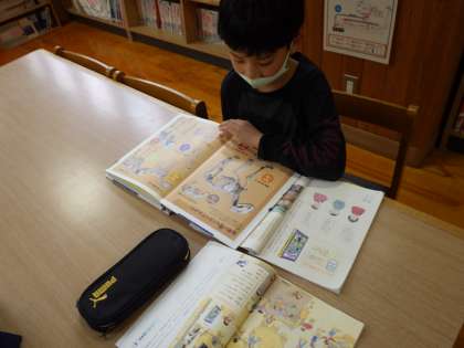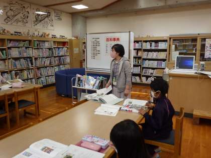 3・4年生国語。図書館司書から事典の探し方、使い方について学びます。